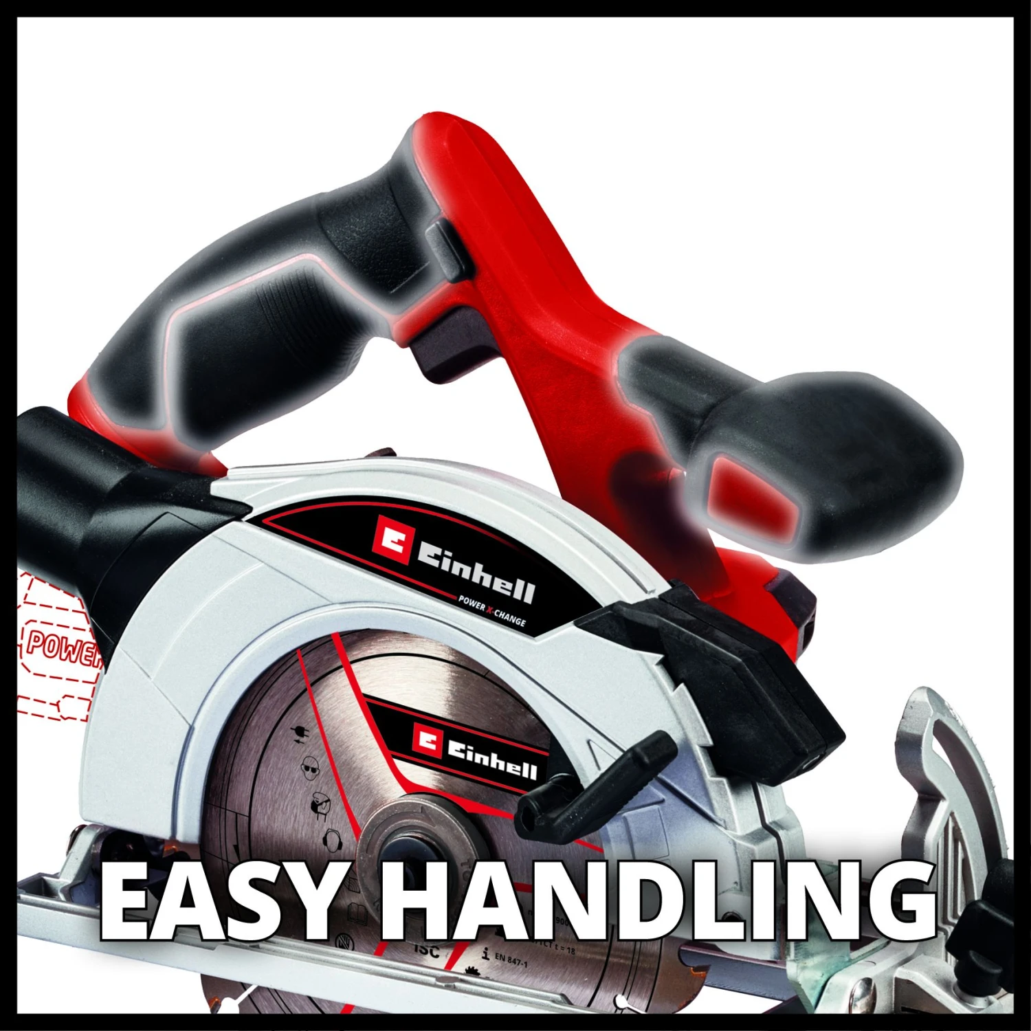De TE-CS 18/165 Li SOLO Accu Handcirkelzaag is een krachtige machine die je helpt bij verschillende zaagwerkzaamheden in en rondom je woning. Dankzij het lichte gewicht en compacte formaat van deze machine, is de accu handcirkelzaag erg gemakkelijk in gebruik. De machine maakt deel uit van de Power-X-Change productlijn van Einhell, waardoor de accu van deze machine te vervangen is door de accu van andere machines uit deze productlijn. Om tot een optimaal resultaat te kunnen komen is deze accuhandcirkelzaag voorzien van een krachtige motor. De motor levert een onbelast toerental tot 4.200 toeren per minuut, wat voldoende is voor zaagdieptes tot 54 en 35 millimeter bij een hoek van respectievelijk 90° en 45° graden. De zaaghoek en zaagdiepte zijn eenvoudig in te stellen zonder gebruik te moeten maken van gereedschap. Dankzij de geïntegreerde stofzuigeraansluiting op deze accu handcirkelzaag is het mogelijk om op een schone ondergrond te blijven werken. Daarbij houd je dankzij deze stofzuigeraansluiting goed zicht op het materiaal waarmee je werkt. Met de spindle-lockfunctie op deze machine is het heel eenvoudig om van zaagblad te wisselen. De machine kan met zaagbladen met een asgat van 10 of 16 mm gebruikt worden. Standaard wordt er een 18 T-zaagblad met een diameter van 165 mm en een asgat van 10 mm meegeleverd. Zo kan je direct aan de slag met zaagwerkzaamheden. Om een veilige manier van werken te bevorderen is deze machine voorzien van ingebouwde LED-verlichting. Met de LED-verlichting houd je een goed zicht op de aluminium zaagschoen. Maak zeer precieze zaagsneden met de meegeleverde zaaglijngeleider en parallelaanslag van deze accu handcirkelzaag. Je kan de machine ook gebruiken in combinatie met de Einhell geleiderail, voor nog preciezere zaagsneden. Deze Handcirkelzaag werkt op een krachtige 18 volt oplaadbare accu uit de Power-X-Change productlijn. Deze accu heeft drie handige LED’s, die je een indicatie van de vulstand van de accu geven. De accu is in verschillende mAh verkrijgbaar. De accu zit niet bij de machine inbegrepen. Heb je al gereedschap van de Power-X-Change-productlijn, dan kun je dezelfde accu’s en lader gebruiken voor deze Handcirkelzaag. Door de technische mogelijkheden van nu met lithium-ion accu’s heeft ook EINHELL een complete productlijn ontwikkelt waarbij de accu’s onderling uitwisselbaar zijn. Binnen deze Power-X-Change productlijn kan je dus één en dezelfde accu in verschillende machines gebruiken. Bijvoorbeeld met de accu van de schroefmachine even snel de graskantjes trimmen, zelfs het opladen van USB producten, alles is mogelijk. Je kan vrijwel alle artikelen uit de Power-X-Change productlijn ook als “KIT” versie (inclusief accu& lader) aanschaffen. Als je reeds een Power-X-Change accu hebt zorgt dit er dus voor dat je veel geld kunt besparen. Doordat EINHELL zelf een intelligent accu systeem heeft ontwikkeld, kan je ook met toekomstige EINHELL machines jouw bestaande accu’s blijven gebruiken. Dit scheelt je geld in jouw portemonnee. Het opladen van de accu voor deze Handcirkelzaag verloopt snel, met de Einhell Power-X-Change 18 volt snellader. De lader zit niet bij de machine inbegrepen.
