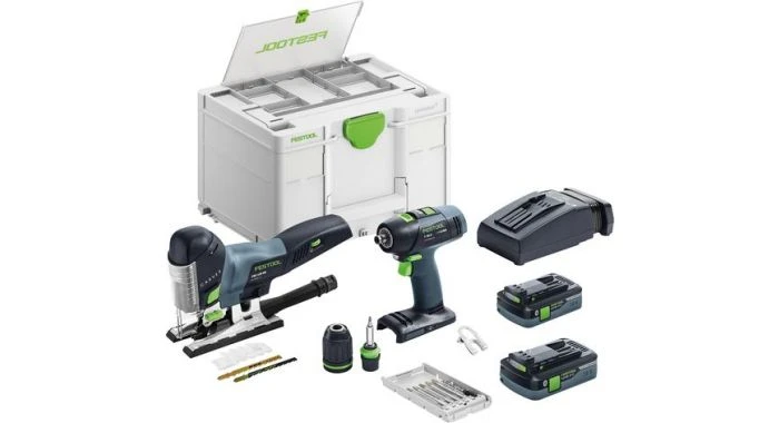 - Compacte montageset – accu-decoupeerzaag en accuschroefboormachine altijd bij de hand