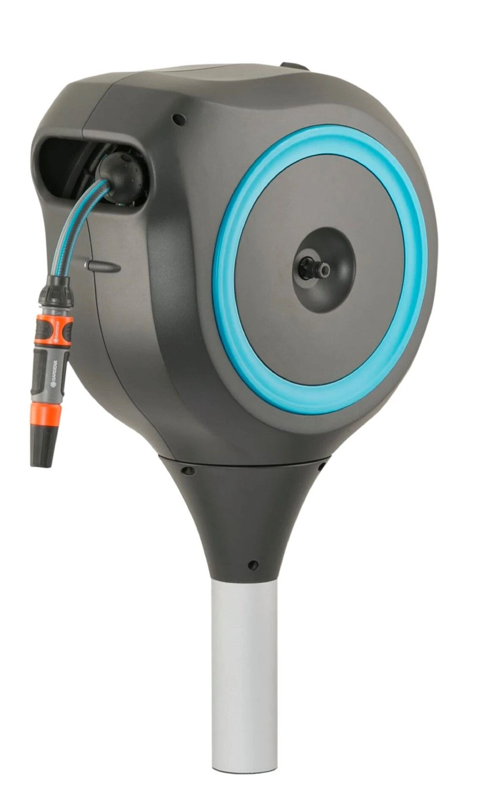 De slangenbox RollUp M van GARDENA biedt niet alleen een veilige en ruimtebesparende opslag voor jouw tuinslang, maar je zal ook blij zijn met de moeiteloze bewatering van jouw middelgrote tuin. De handige slangenbox wordt in de grond verankerd met een stevige standaard op een plek naar keuze in een bloembed of op het gazon. Met behulp van een bevestigingsstang kan je de metalen pen nog eenvoudiger in de grond schroeven. Voor gebruik trek je de 20 meter lange slang uit tot de gewenste lengte en kan je meteen beginnen met bewateren. Dankzij de ingebouwde korte vergrendelingspunten is het hanteren van de tuinslang eenvoudiger dan ooit: zodra je stopt met de slang, wordt de vergrendeling automatisch vastgezet op de gewenste slanglengte. Het innovatieve ontwerp kan 360 graden worden gedraaid, voor maximale flexibiliteit bij het bewateren van de tuin. De box volgt altijd jouw bewegingen, zodat je elke hoek van jouw tuin gemakkelijk kan bereiken zonder dat de tuinslang knikt of in de knoop raakt. Bovendien bespaar je met deze slangenbox vermoeiend opwikkelen en oprollen en heb je geen last van vuile handen: door kort aan het uiteinde van de slang te trekken, wordt de vergrendeling ontgrendeld en wordt de tuinslang dankzij een geïntegreerde stalen veer volledig automatisch en betrouwbaar opgerold. De box heeft een praktische slanggeleider die de slang op zijn plaats houdt, zodat er geen blokkades of knopen optreden. De innovatieve RollControl-technologie zorgt voor veilig, gecontroleerd en moeiteloos oprollen zonder dat de slang in de war raakt. Het hoogwaardige materiaal is bestand tegen UV en vorst, heeft een lange levensduur en is onderhoudsvrij. De box is zeer compact en stijlvol ontworpen, zodat deze eenvoudig in elke tuin kan worden geïntegreerd. Hij is bovendien afgesteld op de hoogte van de GARDENA robotmaaiers, zodat het gazon rond de slangenbox altijd wordt onderhouden en gemaaid. De slangenbox wordt geleverd met een flexibele aansluitslang, alle benodigde montageonderdelen, de Original GARDENA System elementen en een sproeier met twee verschillende sproeipatronen. GARDENA geeft vijf jaar garantie op de slangenbox RollUp M. Bewatering die altijd gebruiksklaar is.