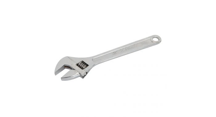 Gesmede, chroom geplateerde moersleutel met gepolijste kaken en een soepele kaakverstelling.
