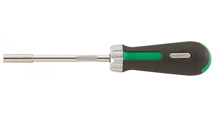 Eenvoudige wisseling van richting (links, rechts en vast) d.m.v. een korte draai aan de schakelring. Ergonomisch gevormde 2-componenten greep met vaste grip voor optimale krachtoverbrenging. Magazijn in de greep voor 6 bits; opent zich m.b.v. drukknop (gr.1). Voor schroevendraaierbits met buitenzeskant 1/4″ DIN 3126/ISO 1173 model C 6,3. 1/4″ doppen kunnen m.b.v. verbindingshulpstuk nr. 3115/1 (buitenzeskant en buitenvierkant 1/4″) worden gebruikt. Eenvoudige verwisseling van schroevendraaierbit door binnenzeskant met magneet. Gekartelde sneldraaizone voor het snel voordraaien van de schroeven. Hoogbelastbaar ratelmechanisme met 48 tanden (werkhoek van 7,5°).