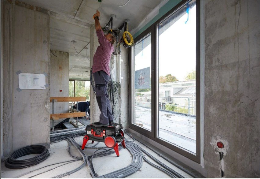 Elektriciens hebben het meest uiteenlopende gereedschap nodig op verschillende plaatsen. Veel gereedschapskoffers bieden onvoldoende stabiliteit en vaak lukt het slechts met grote moeite om alle nodige gereedschappen netjes op te bergen. De gereedschapskoffer XXL III Elektrik van Wiha bevalt daarentegen prima met een uitgebreid gereedschapsassortiment, voldoende opbergruimte en absolute robuustheid. Dankzij de extra grote wielen is het niet moeilijk de koffer op onbegaanbaar terrein of over trappen comfortabel achter zich mee te trekken. Door de uitklapbare poten fungeert de koffer ook als slipvaste trede. Bovendien is door de verhoogde positie een comfortabel uitnemen van de gereedschappen mogelijk, waarbij de rug ontzien wordt. De V-vormige inkeping met schaalverdeling in het kofferdeksel maakt het afzagen van bijvoorbeeld een kabelkanaal op de bouwplaats makkelijker. Door de omvangrijke uitrusting van de XXL III Elektrik heeft men voor iedere toepassing het passende gereedschap steeds bij de hand. Ergonomische schroevendraaiers, innovatieve tangoplossingen, een mobiele schroevendraaier en bitset slimVario® voor het snelle servicegebruik, en vele andere gereedschappen maken het werk van alledag merkbaar makkelijker. Daarbij beschermen de volledig geïsoleerde gereedschappen de gebruiker bij werkzaamheden aan spanningvoerende delen. Tegelijkertijd worden spieren en pezen door het ergonomische handgereedschapsconcept van Wiha, juist bij werkzaamheden in permanent gebruik, duidelijk ontzien. De van robuuste polypropyleen kunststof gemaakte koffer is extra uitgerust met gasveren, die het deksel in verschillende posities vasthouden en kneuzingen aan de vingers door het per ongeluk dichtvallen van het deksel voorkomen.